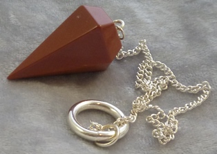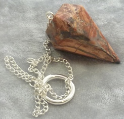Red Jasper Pendulum Faceted measuring 3.6cm long x 2cm at the wide end with a 25cm long chain and ring.